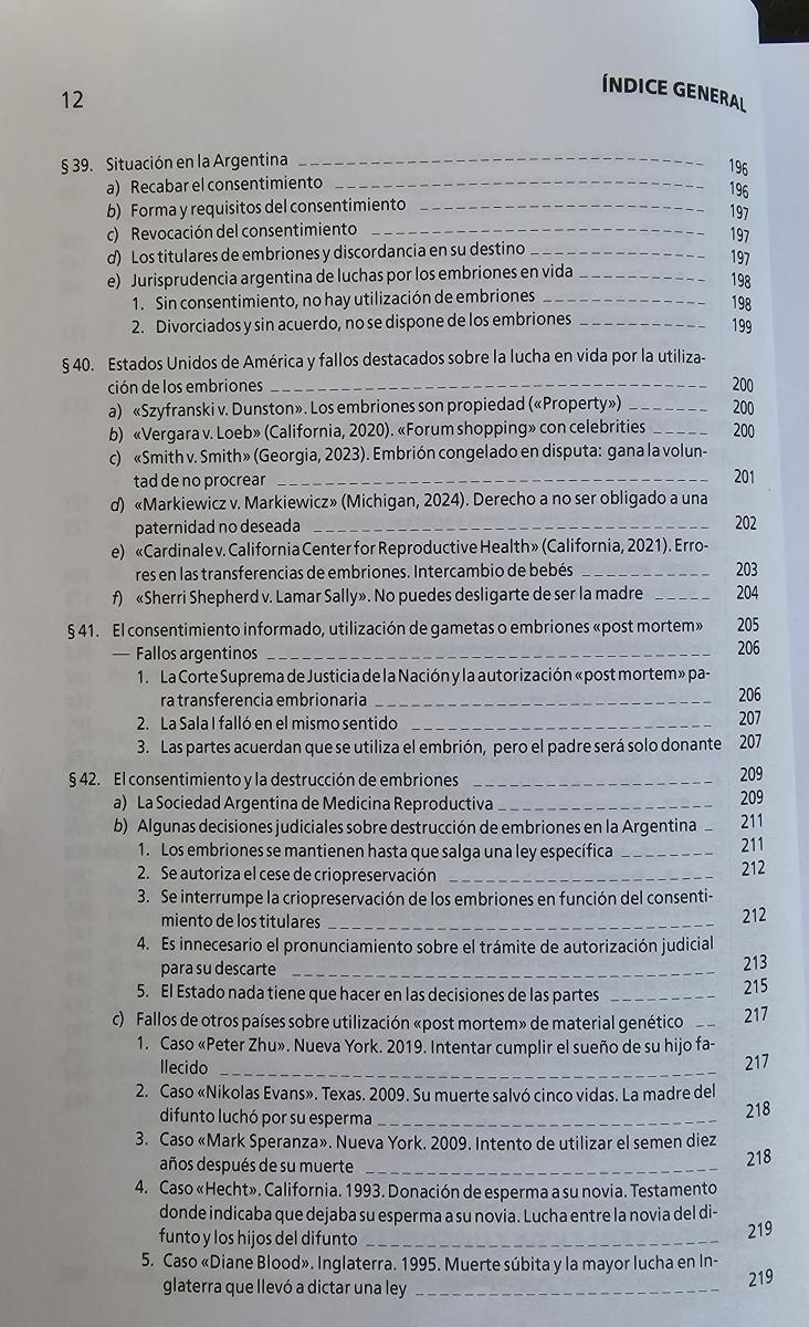 El libro también dedica un apartado al destino de los gametos y embriones, tanto en vida como post mortem, analizando la regulación en Argentina y Estados Unidos, los requisitos del consentimiento informado en estos supuestos y casos jurisprudenciales significativos de distintas jurisdicciones, incluyendo Israel, Canadá y California.